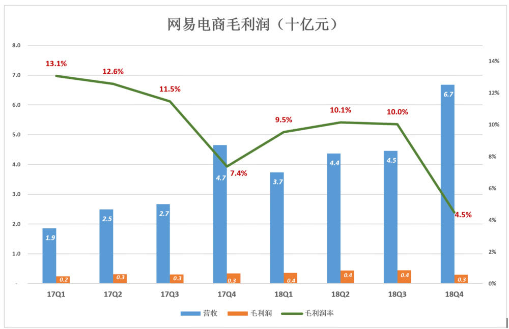 2018年Q4,电商业务收入66.8亿,毛利润不到3亿,毛利润率仅4.5%。