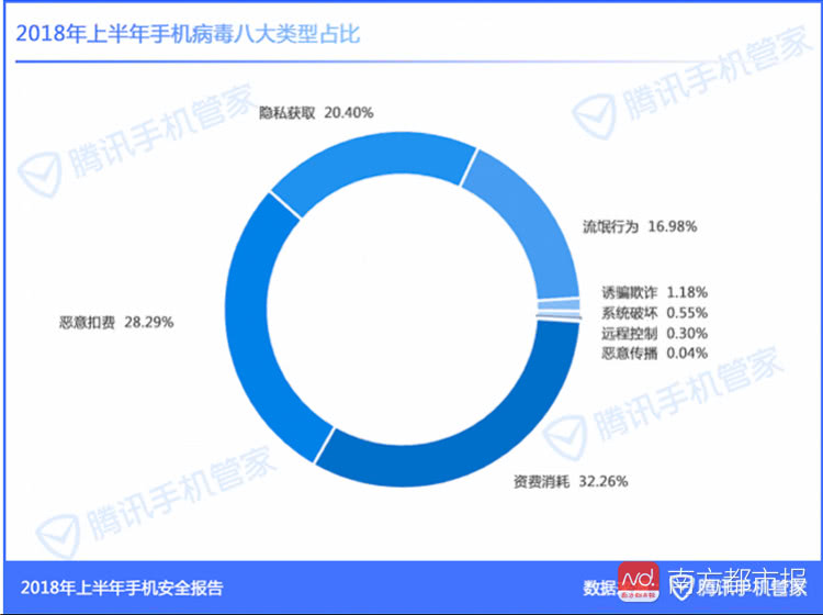 报告发现,纯色情类、短信扣费类、其他扣费类和流氓软件推广类,是手机病毒占比最高的类型,占比分别为20.64%、14.11%、11.28%和10.38%。